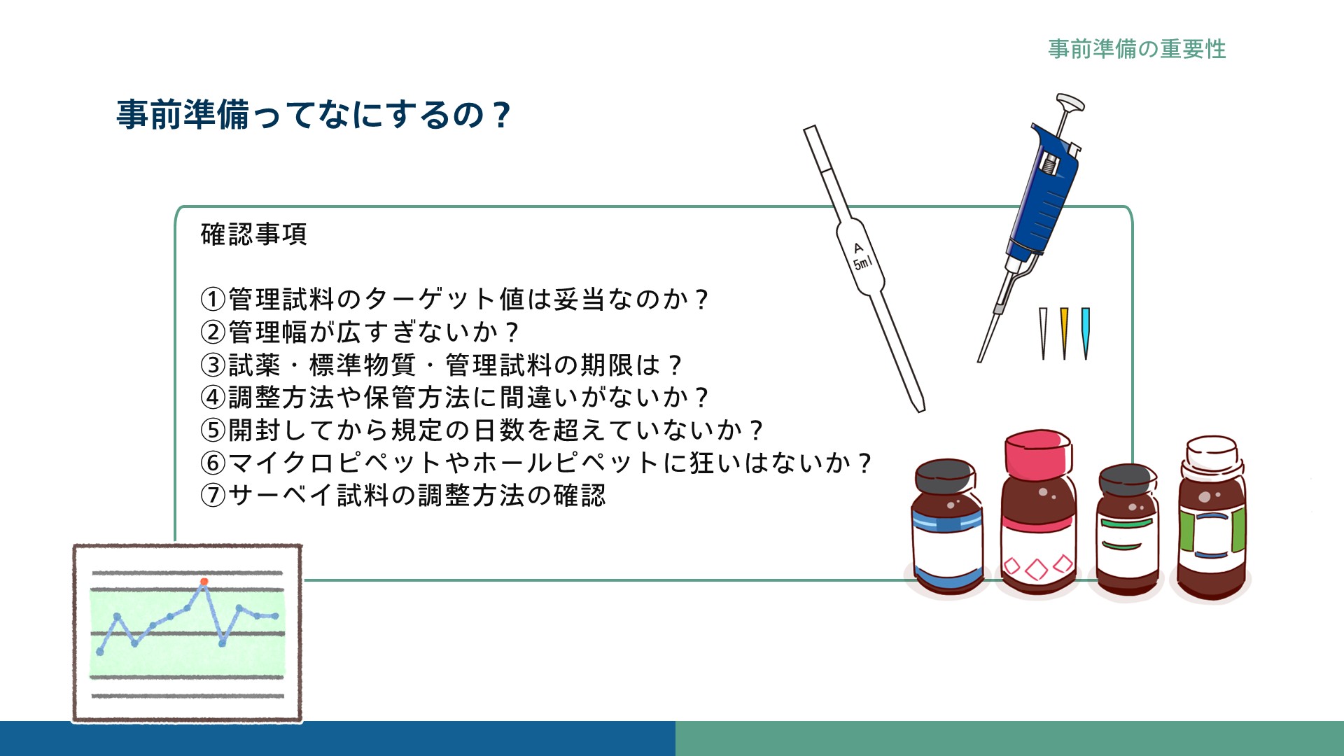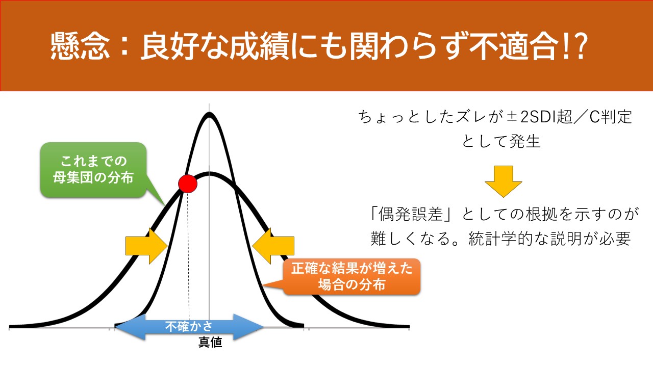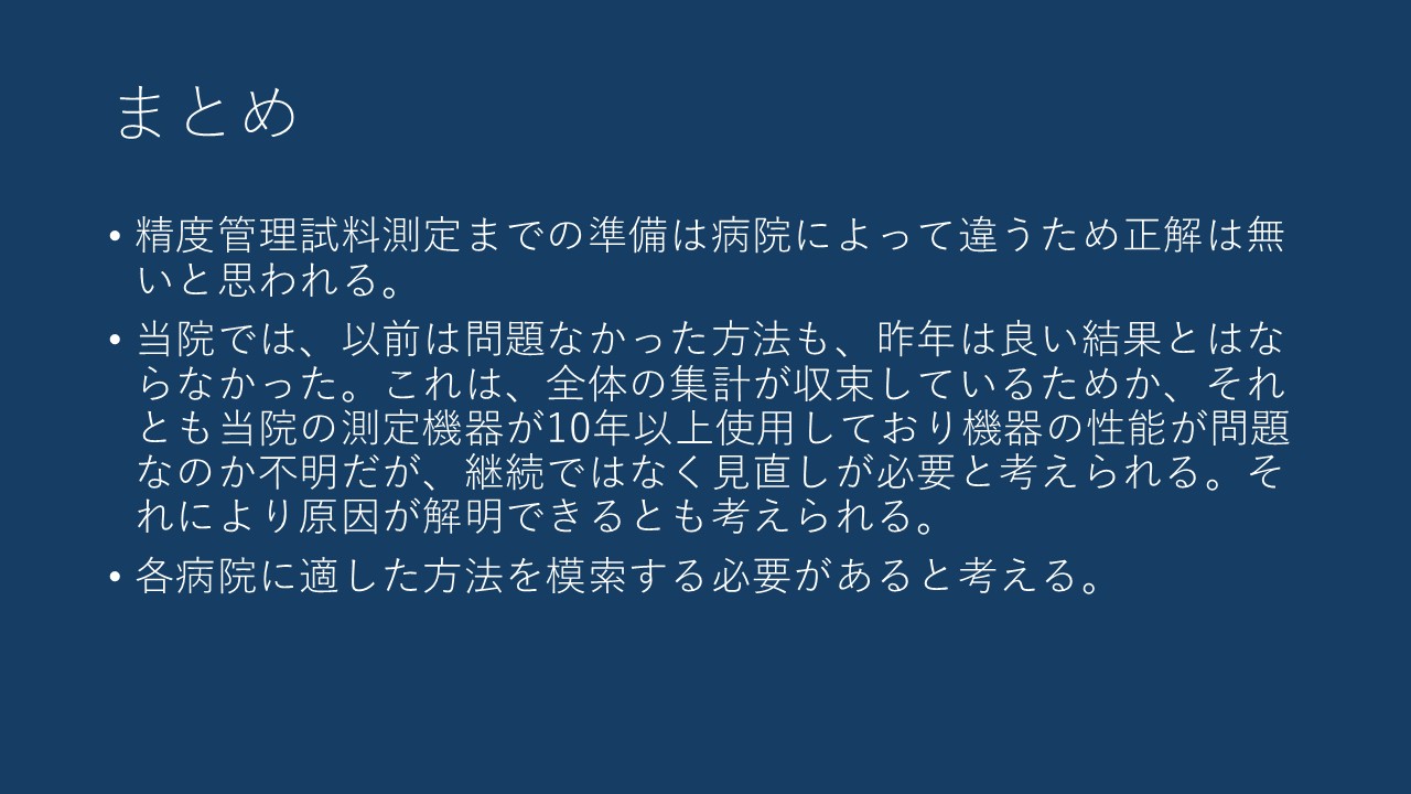 是正処置の考え方や記載方法に関しては、北臨技などで講習会を開催していますが、どの施設も基本的には是正処置はしたくないのが本音と思います。そこで今回は精度管理試料測定後の是正ではなく測定前の実施内容に関して企画したところ旭川医大病院・勤医協一条通病院さんの協力があり実現することが出来ました。講演内容として日々の精度管理・機器メンテナンスが重要性、打ち返しやキャリブレーションの実施、精神統一などがあり、今後の精度管理測定時の参考になったのではと思います。