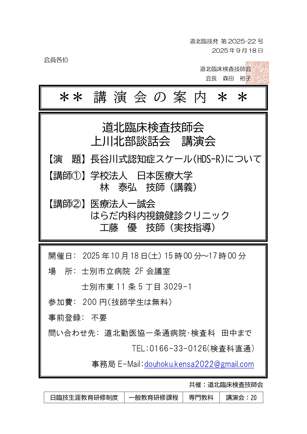 上川北部談話会 講演会 開催のお知らせ(10月18日)