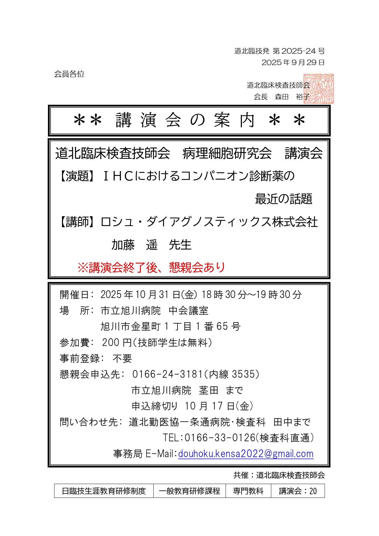 病理細胞研究会 講演会 開催のお知らせ(10月31日)